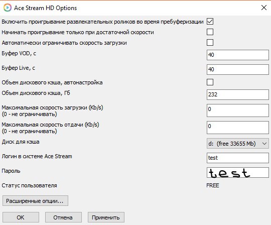 3. Находим AceStream на панели задач - правой кнопкой мыши выбираем "опции" и выставляем значения как на прикрепленном скрине