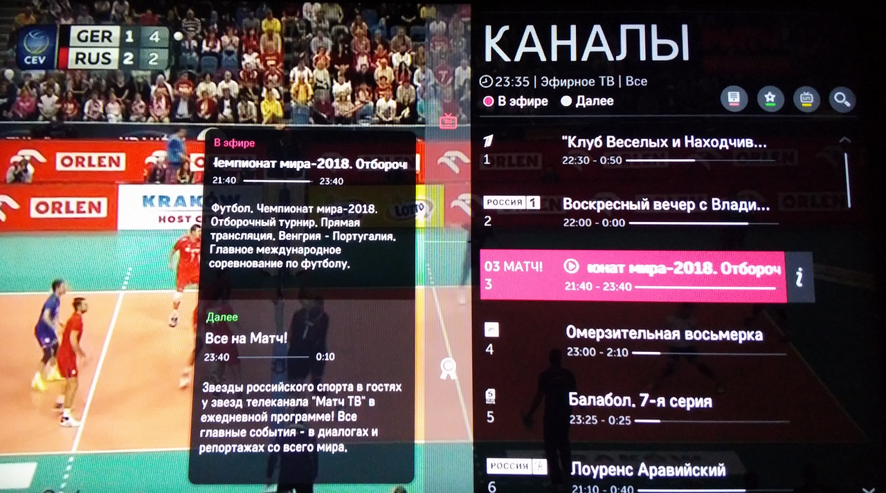 Кнопка App превратилась в красную кнопку ivi для быстрого вызова одноименного приложения онлайн-кинотеатра. Кнопка Live Menu вызывает справа меню отображения списков "Каналы" (тоже самое можно сделать с помощью кнопки LIST) и "Рекомендации".