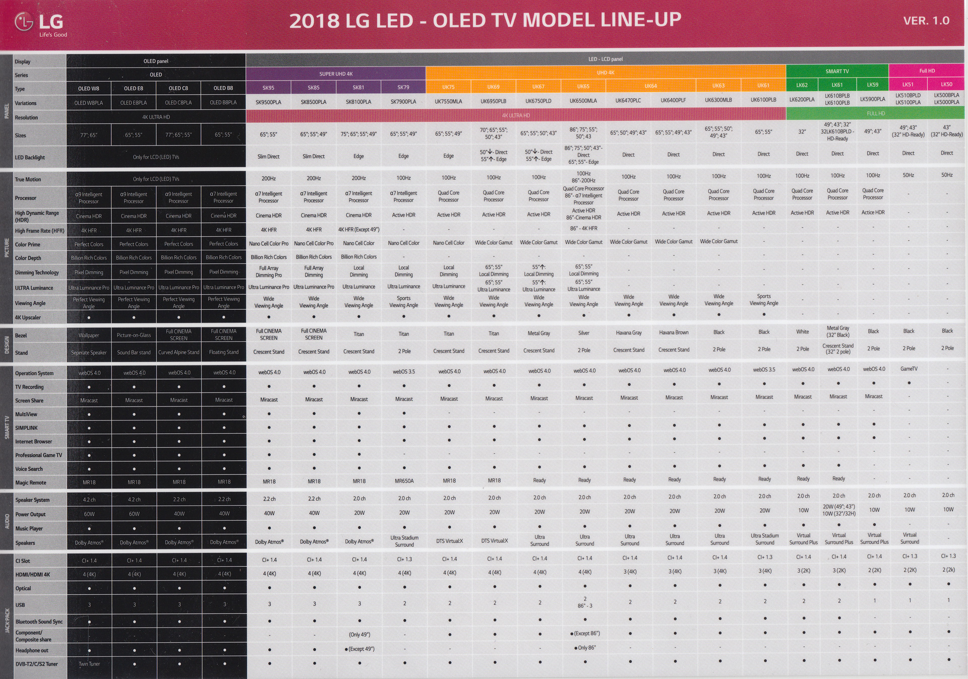 Модельный ряд телевизоров LG 2018 года в одной таблице