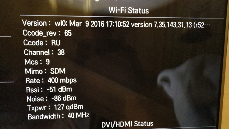 SickMind, а у Вас ТВ какого года? Мне все же хотелось бы заставить свои аппарты работать на 80 Мгц. Есть мысль, что так как они выпущены в 2016 году, то LG сознательно запретил WiFi адаптерам работать с полосой 80 МГц, так как МинКомСвязи разрешил использовать такую ширину полосу только в 2016. https://victorborisov.livejournal.com/288852.html и https://habrahabr.ru/company/cisco/blog/278839/