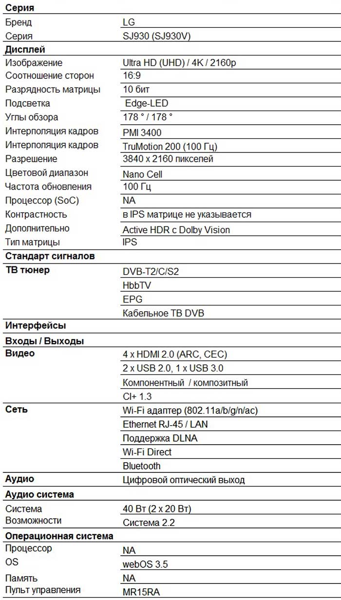 LG SJ930V (как и LG SJ850V/SJ950V) поставляется с IPS матрицей в комбинации с технологией Нано Селл. В совокупности качество изображение воспроизводит точные детали с более широким спектром цветов, отличные уровни черного и хорошие углы обзора. Динамические сцены обрабатываются функцией TruMotion 200, обеспечивающей «плавное и гладкое» изображения в боевиках, спортивных программах и играх.