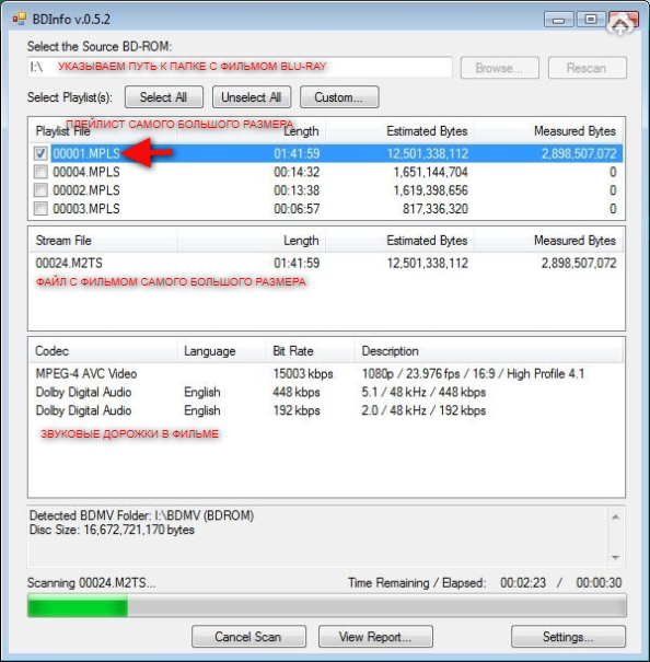В строке поиска указываем путь к папке с фильмом, остальное программа сделает сама. Она покажет самый большой плейлист в фильме, покажет самый большой файл фильма и покажет звуковые дорожки которые присутствуют в фильме. Для того что-бы не перепутать какие звуковые дорожки исключить в программе tsMuxeR не закрываем программу BDinfo.