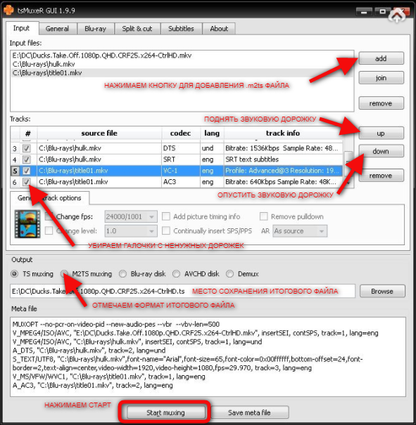 В строке поиска указываем путь к самому большому файлу с расширением .m2ts папка STREAM(название файла из программы BDinfo). Если необходимо переместить нужную дорожку повыше то кнопкой UP делаем это. Если необходимо удалить дорожку из итогового файла, просто снимаем галочку(необходимые звуковые дорожки и файлы субтитров сверяем с программой Bdinfo что бы не удалить нужную звуковую дорожку или субтитры). Указываем формат для сохраняемого файла .m2ts и указываем место для его сохранения(лучше не в исходную папку а в другое место,что бы потом заменить старый файл до редактирования новым). Жмём старт и радуемся результату. У меня всё получилось на 5+