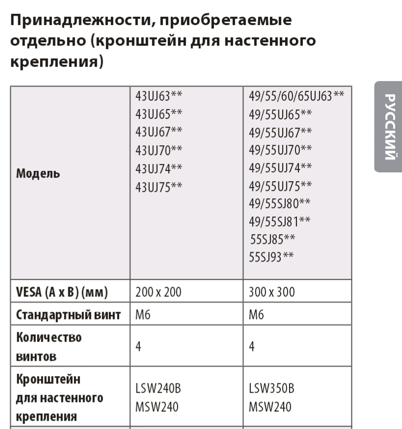 Судя по инструкции к вашему тв, вам нужно крепление LSW350W или MSW240, либо аналоги стандарта VESA 300 x 300, выдерживающие вес 23 кг и более.