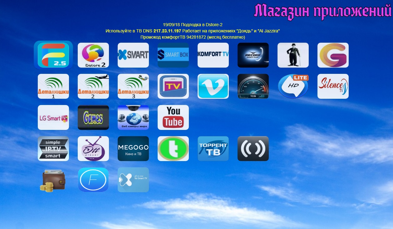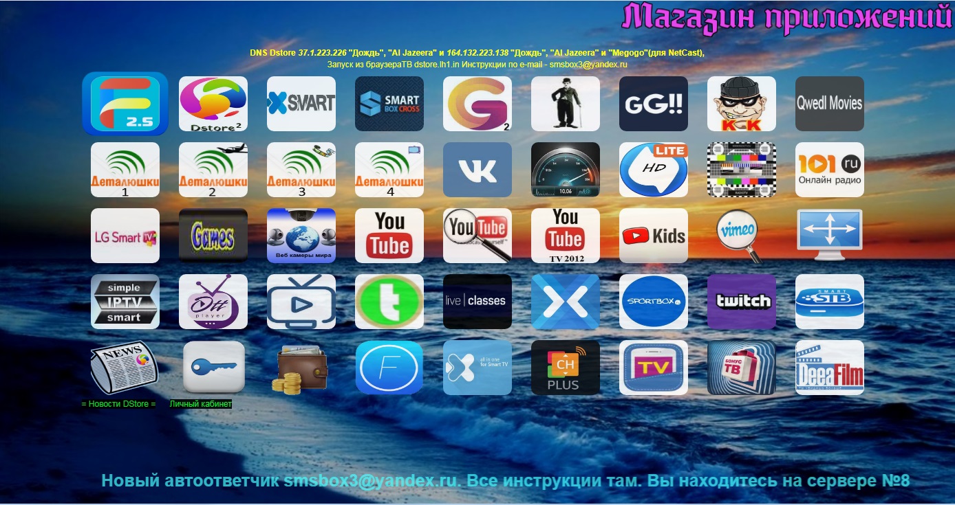 Подключить ТВ можно, через флешку для NetCase и webOS (1.0-3.5) для работы v3 (расширенная) https://yadi.sk/d/YRusopcnH4KrfQ зеркало https://cloud.mail.ru/public/4sww/27dWHtRFY. На webOS 4.0 и старше флешка не работает! Необходимо использовать либо ipk либо локальный ДНС на роутере либо в настройках сети установить вручную ДНС 5.45.70.131, затем установить приложения "Фокус лайф" и "Al Jazzira"из стандартного магазина LG и теперь при запуске по иконке Дождь будет загружен Dstore-2 при запуске Al Jazzira будет загружен Dstore-2, про другие ДНС, которые вы можете включить себе в личном кабинете см. smsbox @ Неофициальный магазин приложений Dstore для webOS