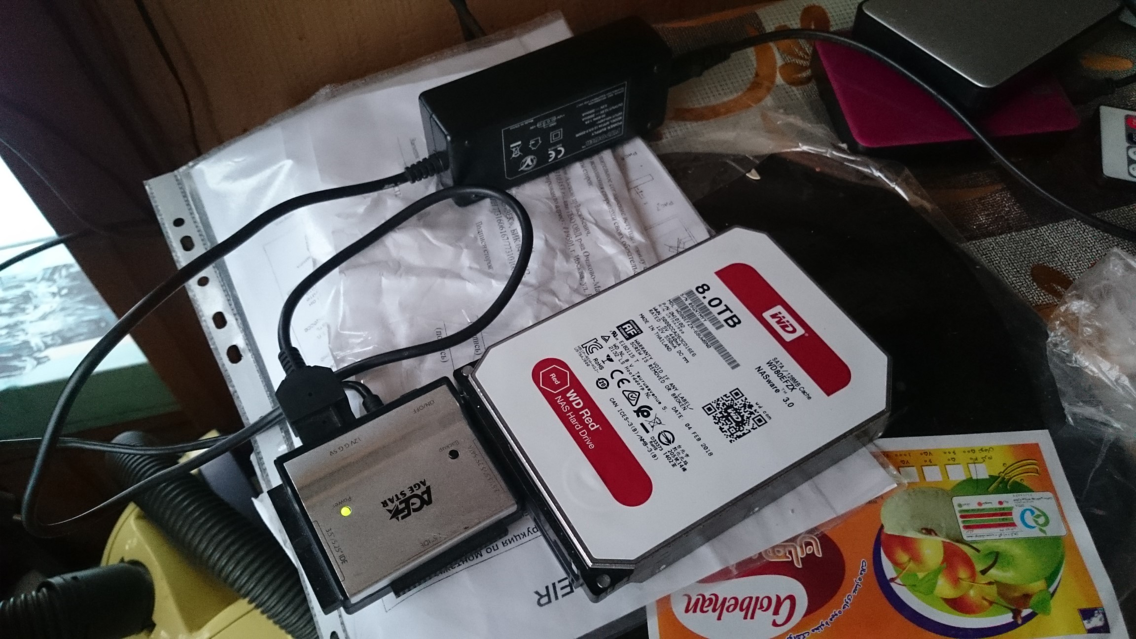 Питание, как вы понимаете, 3.5" диску нужно от отдельного блока питания (он в составе коробки/переходника).