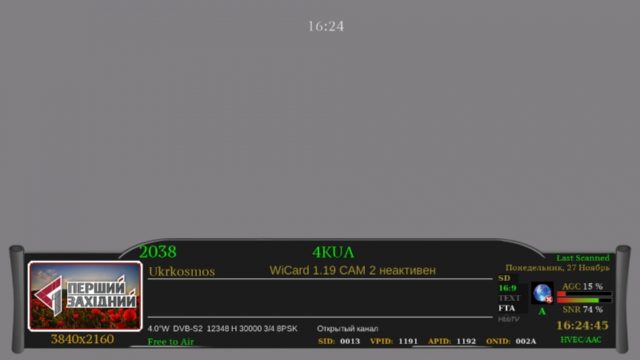 Данный скриншот был размещён на нескольких сайтах, посвящённых спутниковому телевидению от пользователя с ником puteez. Он же сообщил, что первоначально канал прописался в HEVC, затем был переведён в MPEG-4. Больше никакой информации получить пока не удаётся. Единственный момент — из пакета «Укркосмос» с появлением 4K UA ушёл канал «Первый западный» («Перший захiдний»).