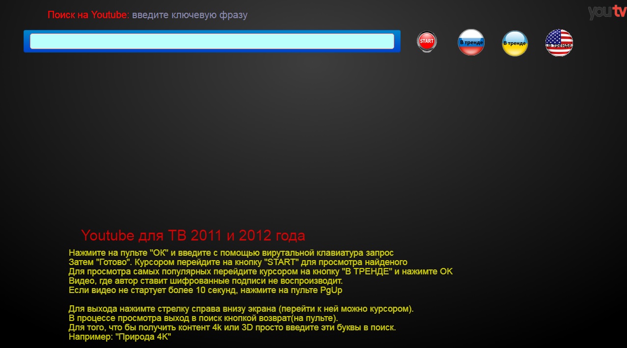 Виртуальная клавиатура, управление курсором или мышью, набираем текст и нажимаем кнопку готово, затем курсором перемещаемся в start и понеслось. В дальнейшем буду дорабатывать и интерфейс и вывод топов и пр. Но это уже вполне рабочее приложение. Управление просмотром кнопками на пульте PgUP PgDown - переход к следующем видео, возврат - выход в меню поиска другого ролика. При поиске создается список просмотра на 30 сюжетов по заданной теме, пока сортировки там нет, но планирую сделать от наиболее свежих к старым. Чтобы убрать (проявить) название ролика можно нажать на кнопку info.