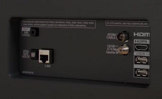 Задняя панель телевизора LG B8 оснащена следующими интерфейсами: один вход HDMI, 2 антенных входа (для спутникового и кабельного/эфирного ТВ), один порт LAN (со скоростью 100 Мбит/сек) и два порта USB (версии 2.0). Что касается аудио, то на этой же панели расположен только оптический аудиовыход. Выхода 3,5" для наушников в телевизоре нет.