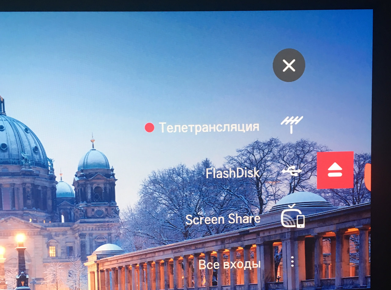 Для этого нажмите клавишу Input и выберите источник изображения: USB флешку или соответствующий HDMI вход, если транслируете с ПК/ноутбука.
