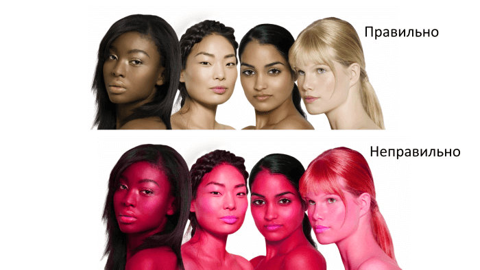 Настройка насыщенности цвета и цветовой температуры выполняется по оттенку человеческой кожи. Для того чтобы получить правильные настройки цветности потребуется тестовая картинка с изображенными на ней женщинами. У них разный цвет кожи, подстраивать регуляторы нужно так, чтобы кожа смотрелась естественно. Для этого двигайте клавишами пульта ползунок параметра цветности в меню до тех пор, пока все лица не станут выглядеть натуральными.