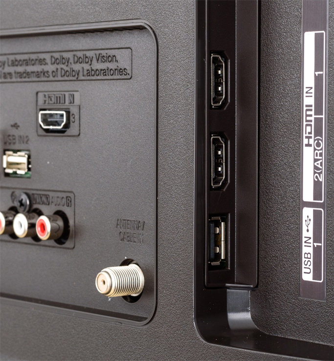 Боковая панель оснащена двумя входами HDMI v2.0 (один из которых совместим с ARC), одним разъемом USB 2.0 и слотом условного доступа CI+ версии 1.3. Кроме того на борту имеется встроенный Wi-Fi модуль (с поддержкой стандартов 802.11a, 802.11b, 802.11g, 802.11n, 802.11n 5 ГГц, 802.11ac, Wi-Fi Direct).