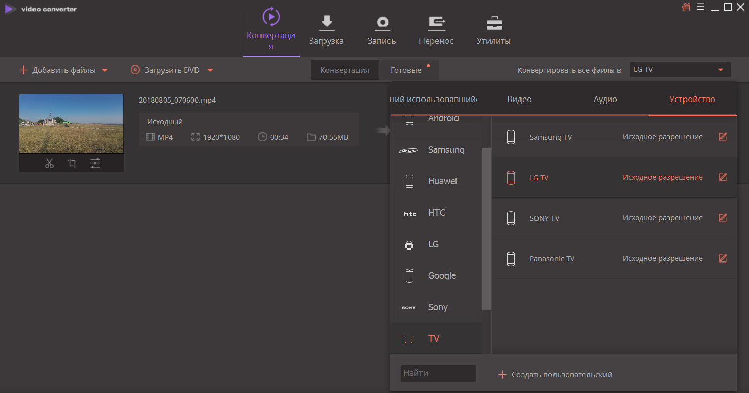 Так как мне нужно все же мое видео, я конвертировал свой видео файл через программу Wondershare Video Converter (указал, что конвертировать надо для телевизоров LG).