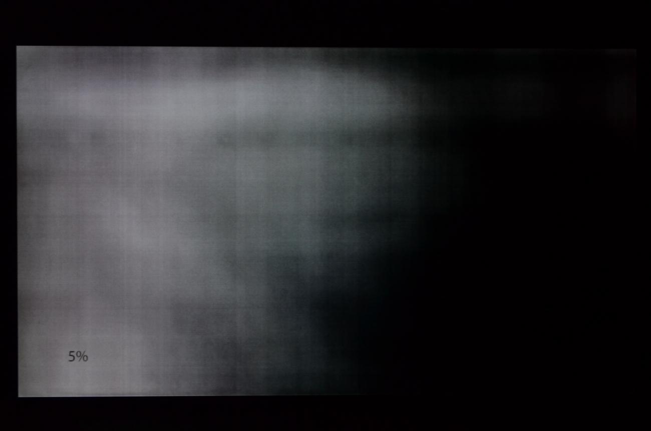Эти телевизоры имеют проблемы, которые не отражены в многочисленных обзорах в Интернете. Но вы найдете его в личных комментариях в нескольких форумах. Это равномерность изображения в темных сценах. Вы не заметите эту проблему в магазине. Там размещены яркие рекламные фильмы, которые выглядят фантастически. Кроме того, в магазине сильно освещен, и вряд ли заметит, что вы взяли ваши глаза, как вы получите и запустить какой - нибудь фильм ужасов с большим количеством темных сцен. Тогда, наверное, как и я, вы будете просматривать Интернет, и вы найдете тест видео для воспроизведения градаций серого цвета от 5% до 50%. Вот то, что я видел, когда я играл такой тест: