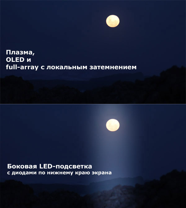Возьмем, к примеру, ночной пейзаж с яркой полной луной на небосводе. В идеале луна должна быть яркой, а остальная часть сюжета темной. На экранах плазменных, OLED-ТВ и телевизоров с матричной подсветкой экрана так и будет: яркость луны не перетекает на остальную часть изображения. А вот в телевизоре с нижней LED-подсветкой панели, чтобы сделать луну яркой, определенные диоды будут светить ярче, потому на экране более яркой будет не только луна, но вся часть изображения над и под ней, что не соответствует исходной картинке. Если немного пофотошопить, то это можно изобразить примерно так: