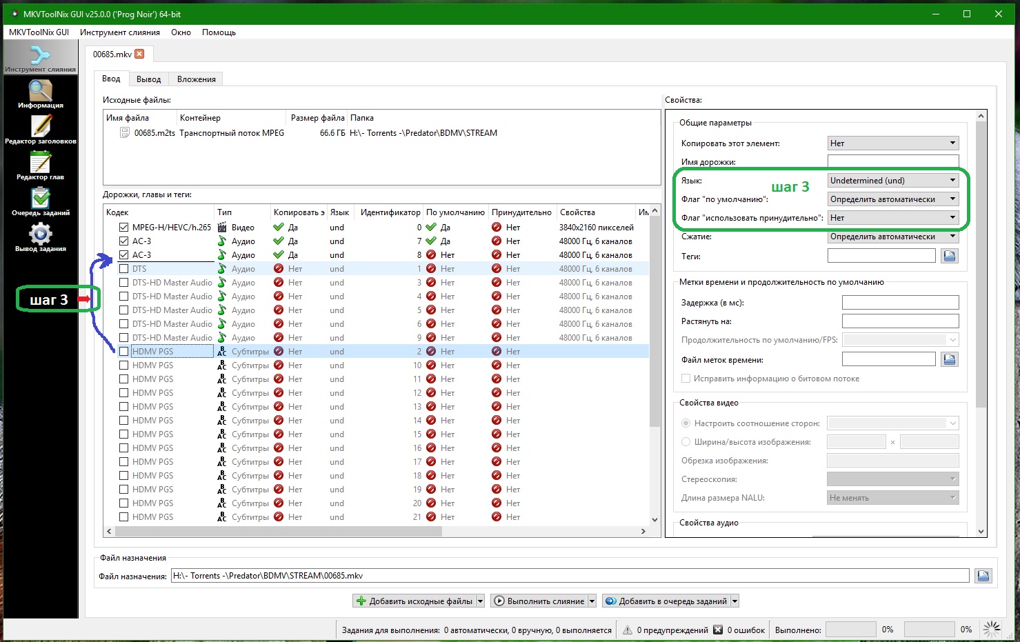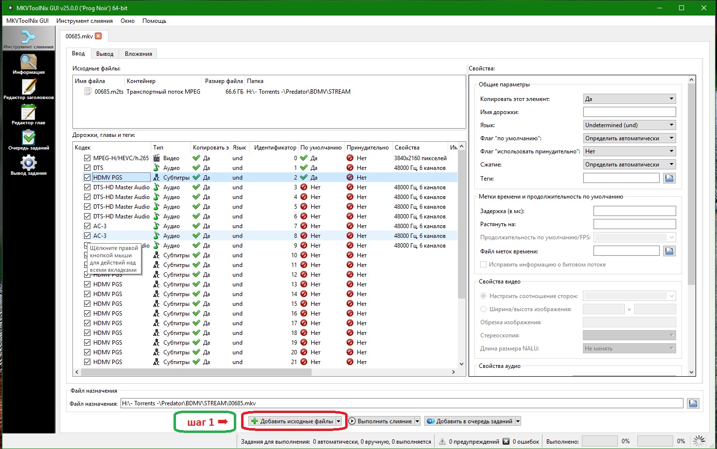 В моём случае поток "Видео 2" пришлось удалять, ибо "старый добрый HDR" не захотел воспроизводиться. Удалил также и те звуковые дорожки, которые мне не нужны или моему телевизору не по зубам прожевать.