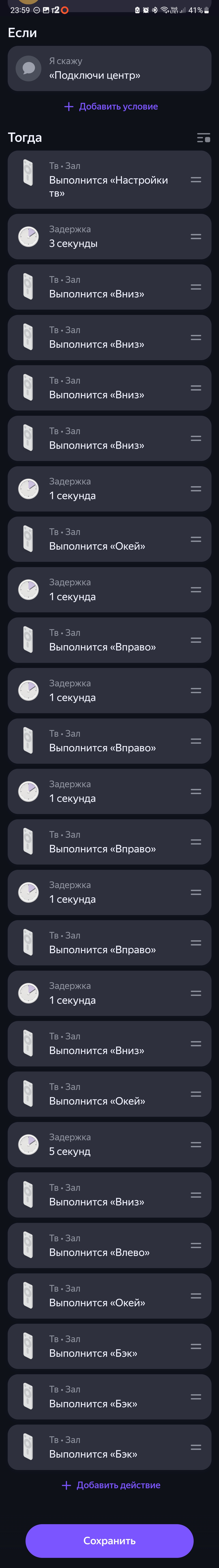У меня сейчас по фразе - "давай посмотрим кино" еще сценарий. Она включает телевизор, колонки, и блютуз на станции мини, которая к этим колонкам подключена.