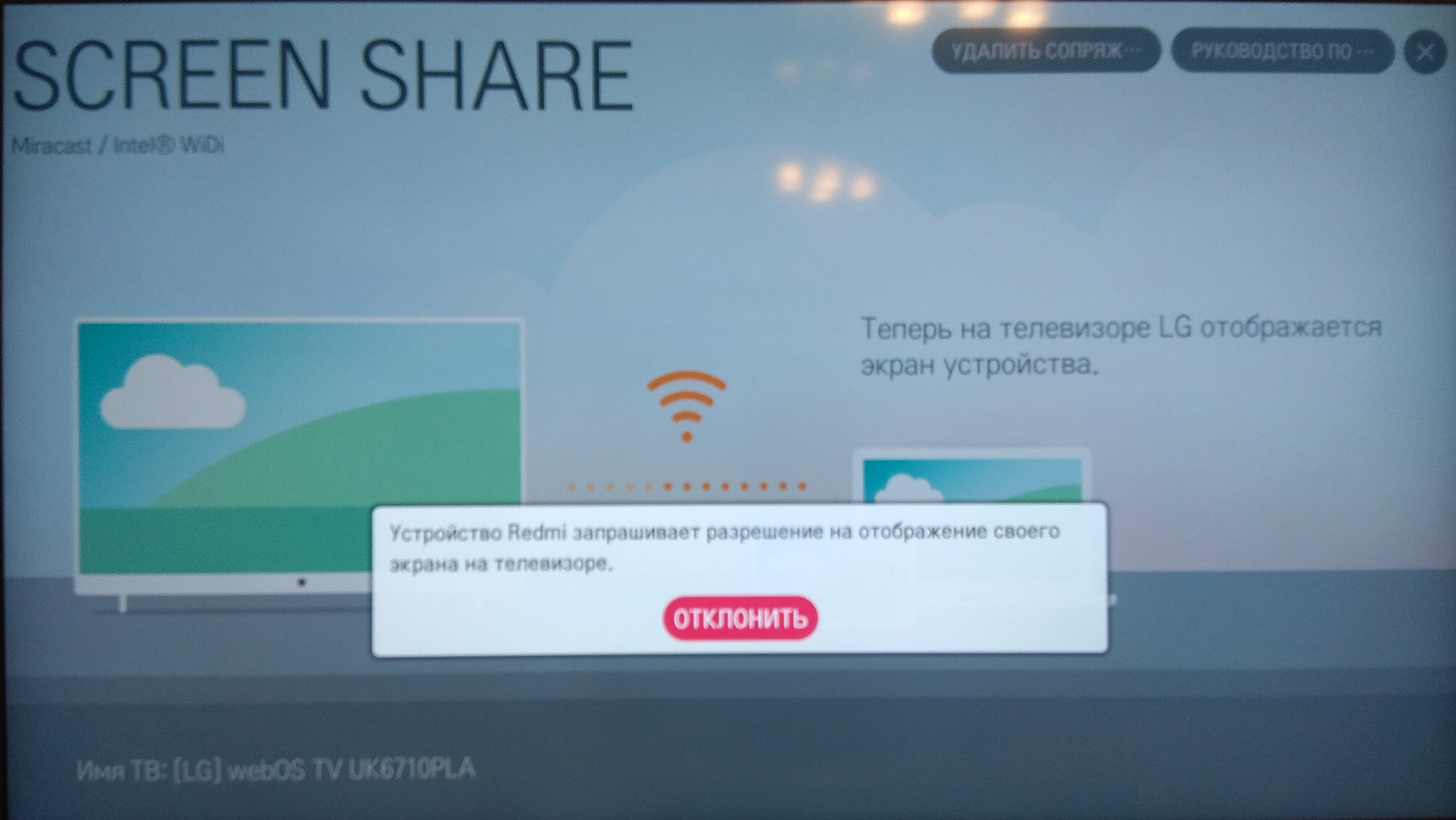 На LG 70UK6710PLA никак не могу этого сделать, на смартфоне висит подключение а на тв картинка