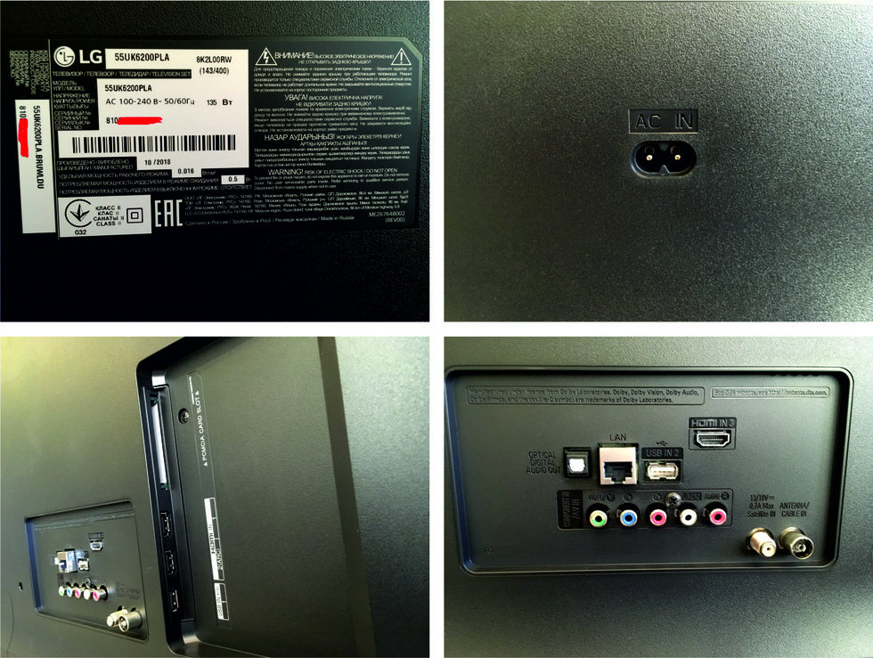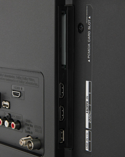 Рассмотрим поближе - информационная наклейка, разъем питания, антенный и спутниковые разъемы, цифровой оптический выход, сетевой разъем (RJ-45), компонентный аудио и видео вход, два USB-разъема, три HDMI-разъема и PCMCIA - слот):