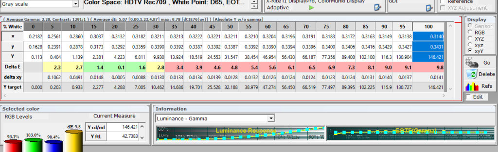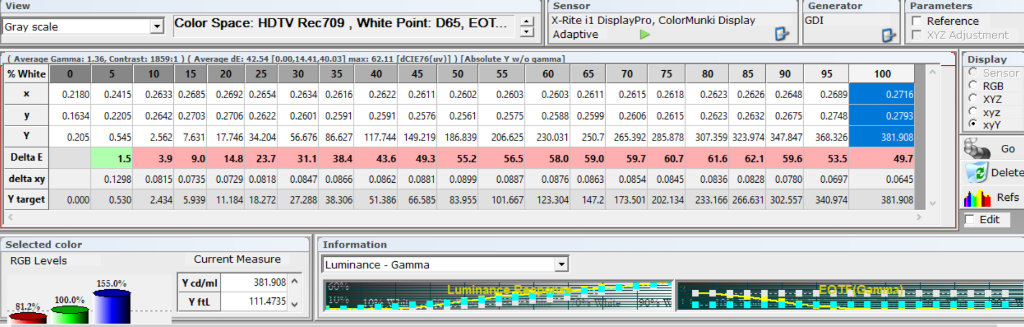 На 100% белом в Ярком режиме 422 люкса в центре - почти на уровне 43NU7120. При этом коэффициент мерцания 8% - на карандаш не видно, но выше рекомендованных значений для ноутбуков/мониторов (менее 5%).