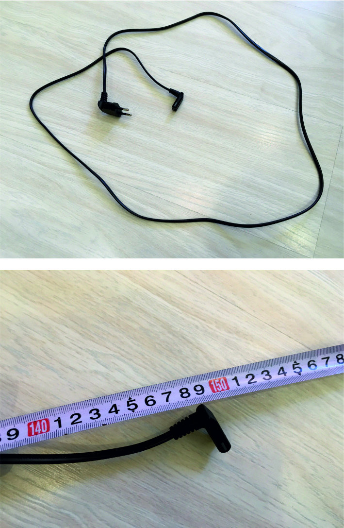 Сетевой кабель (странно что без заземляющего контакта), длиной в 1,5 метра, разъемы "Г" -образные: