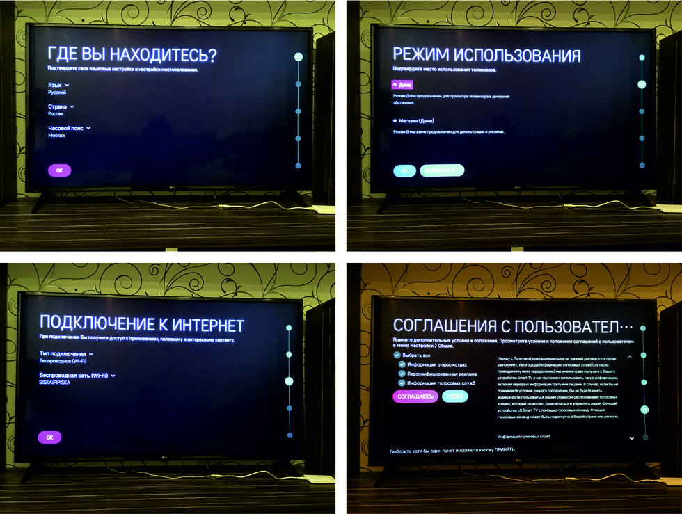 Выбираем местоположение, режим работы (дом/магазин), подключаемся к домашней сети (по Wi-Fi или кабелем), принимаем соглашение между производителем и пользователем.