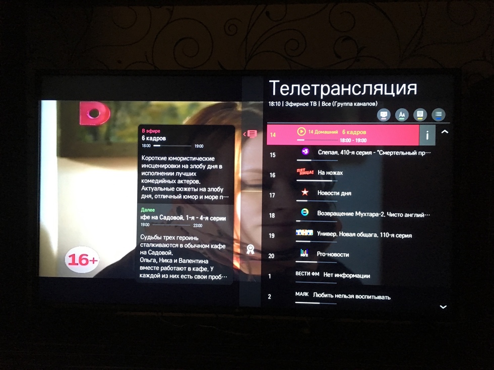 Цифровое же вещание (DVB-T2) выглядит очень прилично. Благодаря обработке сигнала телевизором картинка оживает, появляется эффект 60 fps, выглядит более приятной и реалистичной: