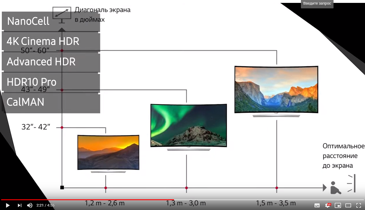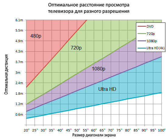 Выбор диагонали телевизора не такая простая проблема, как это может показаться. Чтобы принять оптимальное решение, необходимо заранее определиться с местом установки телевизора: это позволит правильно рассчитать расстояние между экраном и телезрителем. Также следует учитывать величину разрешения экрана. Ниже приведена диаграмма, с помощью которой можно определить оптимальное расстояние до телевизора в зависимости от разрешения видеосигнала и размера экрана.