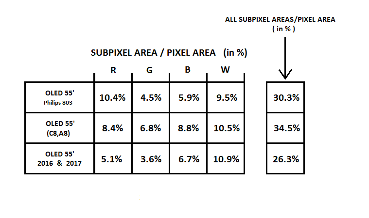 Пользователь bombyx с AVS forum произвел расчет площади субпикселей в олед тв разных годов:
