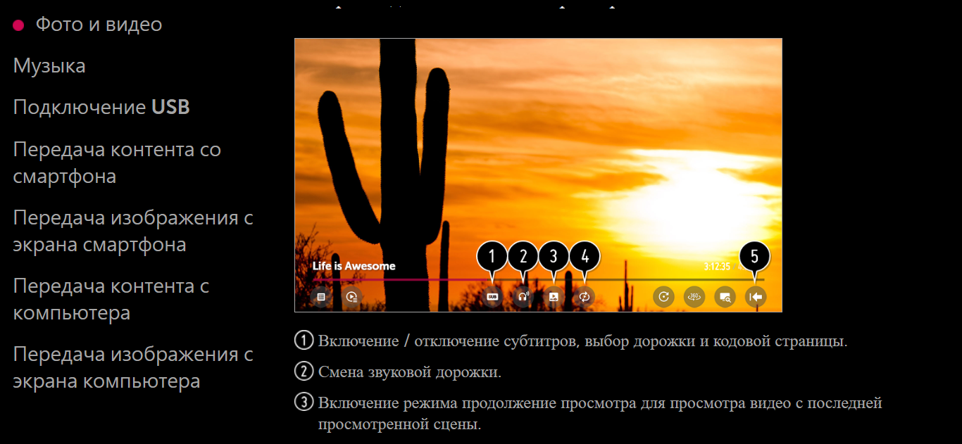 На телевизорах LG, работающих под управлением операционной системы webOS, существует возможность включать и отключать субтитры при просмотре видео с внешнего USB накопителя. Выбор субтитров производится следующим образом: