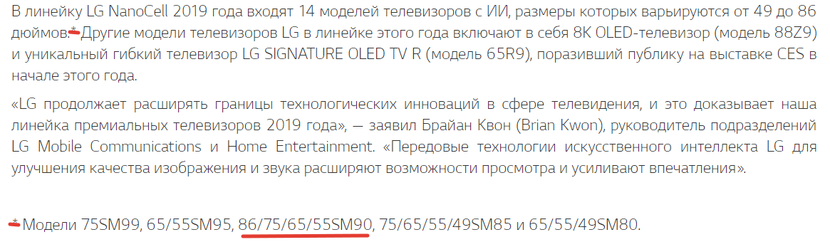 Модеь Начало продаж Цена 75SM9900 (8K) 2 полугодие 2019 ??? 65SM98007LA май 2019 2.299 € 55SM98007LA май 2019 1.699 € 75SM9000PLA май 2019 2.999 € 65SM90107LA апрель 2019 1.999 € 55SM90107LA май 2019 1.499 € 49SM90007LA май 2019 1.199 € 75SM8610PLA май 2019 2.499 € 65SM86007LA апрель 2019 1.799 € 55SM86007LA апрель 2019 1.299 € 49SM86007LA апрель 2019 1.099 € 65SM8500PLA май 2019 1.699 € 55SM8500PLA май 2019 1.199 € 49SM8500PLA май 2019 999 € 65SM82007LA май 2019 1.499 € 55SM82007LA май 2019 999 €
