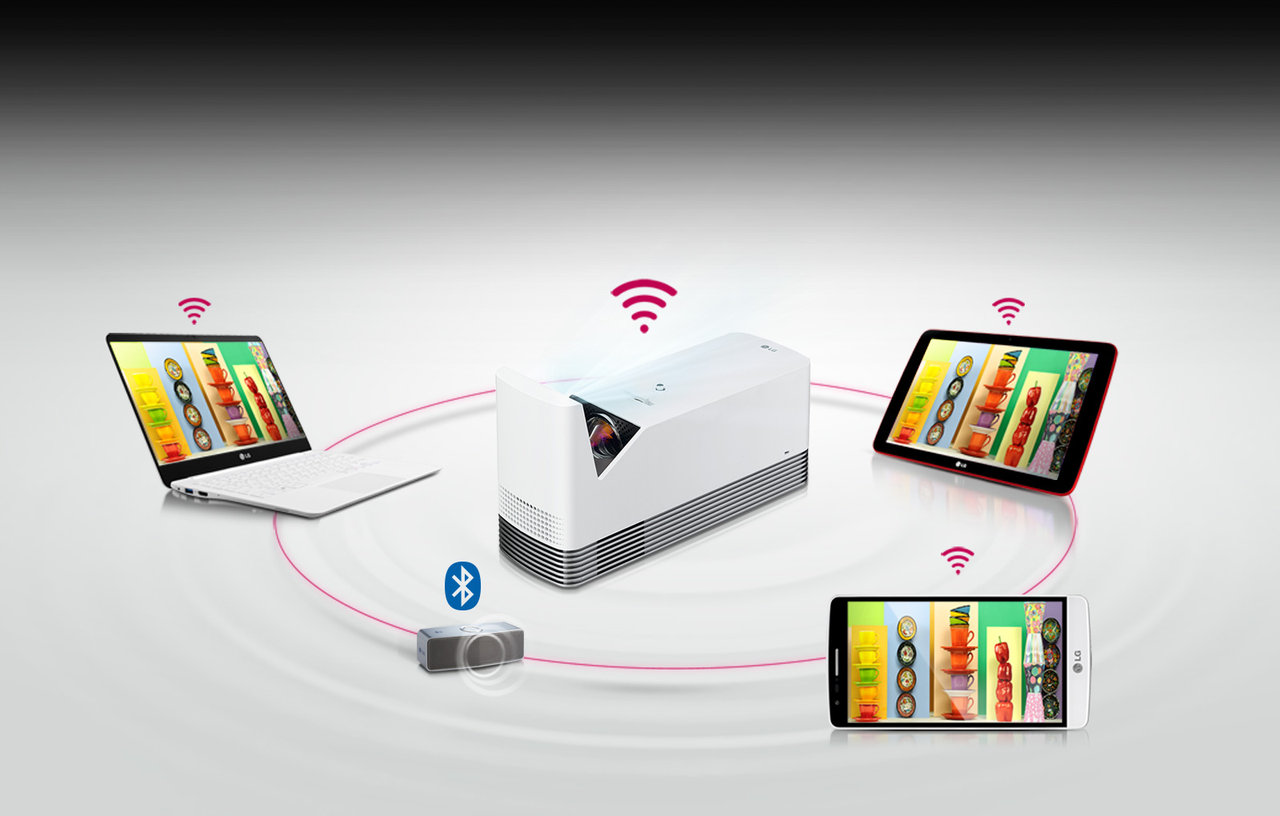 В отличие от обычных проекторов, HF85LSR поддерживает функцию беспроводной передачи изображения, звука и видеоконтента при подключении к ПК, смартфонам через Screen Share и беспроводной акустике по Bluetooth.