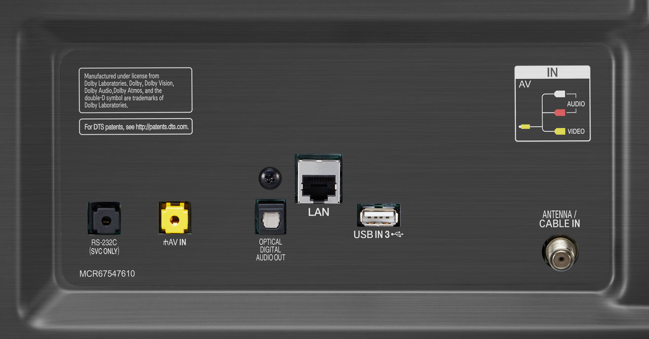 Задняя панель телевизора LG SM9900 оснащена следующими интерфейсами: 2 антенных входа (для кабельного/эфирного ТВ), компонентный AV-вход (только в версии для США), один порт LAN (со скоростью 100 Мбит/сек), один порт USB (версии 2.0). Что касается аудио, то на этой же панели расположен только оптический аудиовыход. Выхода 3,5" для наушников в телевизоре нет.