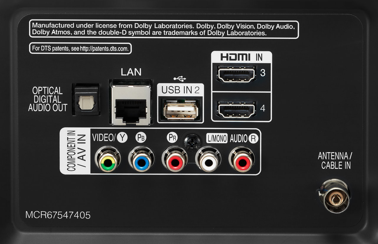 Задняя панель телевизора LG UM7510 оснащена следующими интерфейсами: два входа HDMI, 2 антенных входа (для спутникового и кабельного/эфирного ТВ), компонентный AV-вход (в версии для США), один порт LAN (со скоростью 100 Мбит/сек), один порт USB (версии 2.0). Что касается аудио, то на этой же панели расположен только оптический аудиовыход, выход 3,5" для наушников отсутствует.