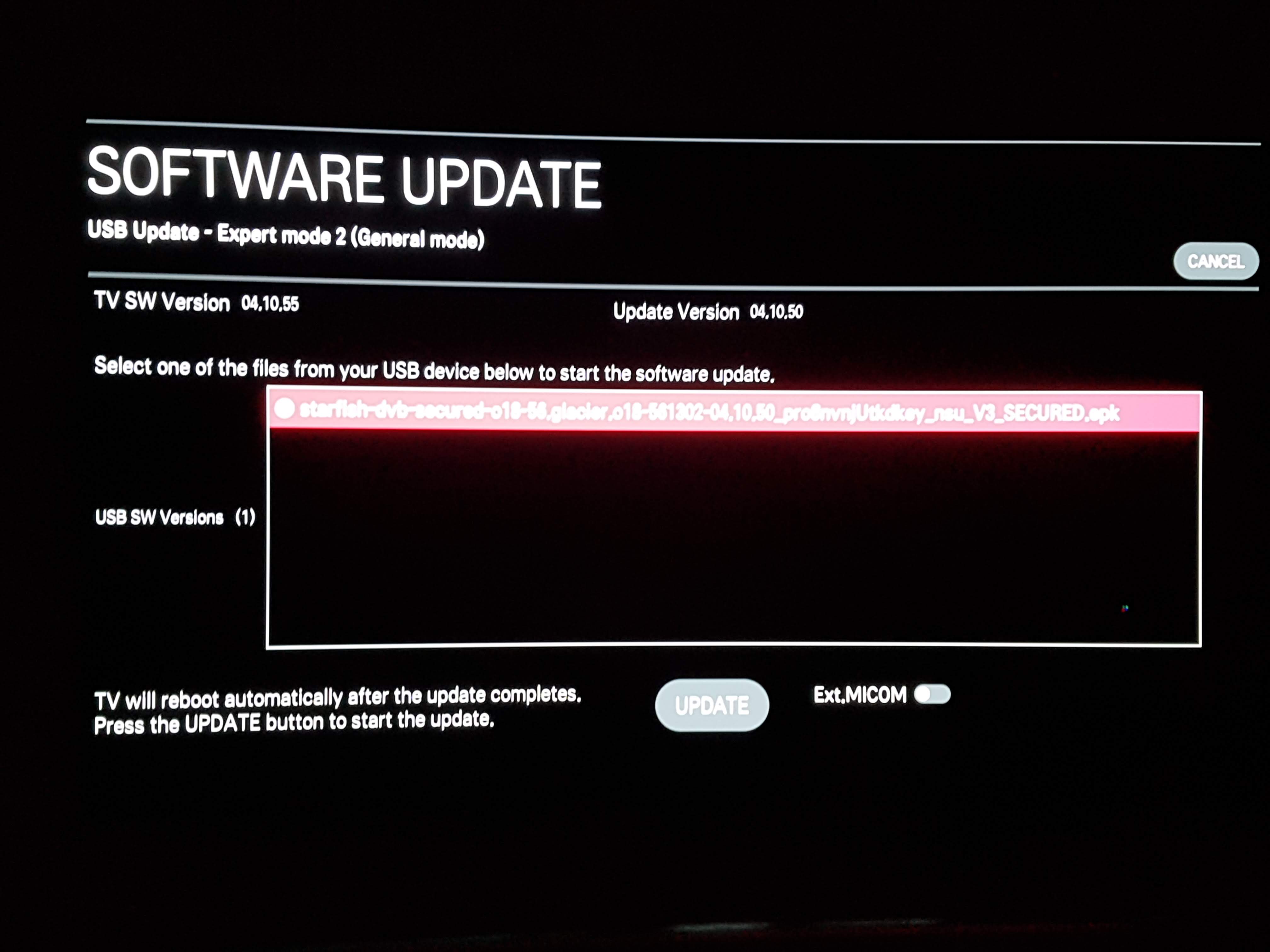 Tibidabo писал(а):Пришло обновление 04.10.55, обновился и вуаля, соотношение сторон испортилось, даже вручную не могу настроить. Подключён через HDMI к компьютеру, и делал полный сброс и страну менял, дохлый номер. Ещё исчезла возможность по нажатии на пульте на микрофон чтобы он искал информацию в ютубе, ищет только в интернет браузере. Рекомендую не спешить с установкой этого обновления. Также был бы благодарен если бы кто скинул старую прошивку :!: