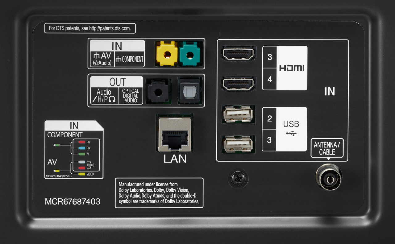 Задняя панель моделей LG 43UM7650 и 50UM7650 оснащена следующими интерфейсами: два входа HDMI, 2 антенных входа (для спутникового и кабельного/эфирного ТВ), компонентный AV-вход (в версии для США), один порт LAN (со скоростью 100 Мбит/сек), один порт USB (версии 2.0). Что касается аудио, то на этой же панели расположен только оптический аудиовыход, выход 3,5" для наушников отсутствует.