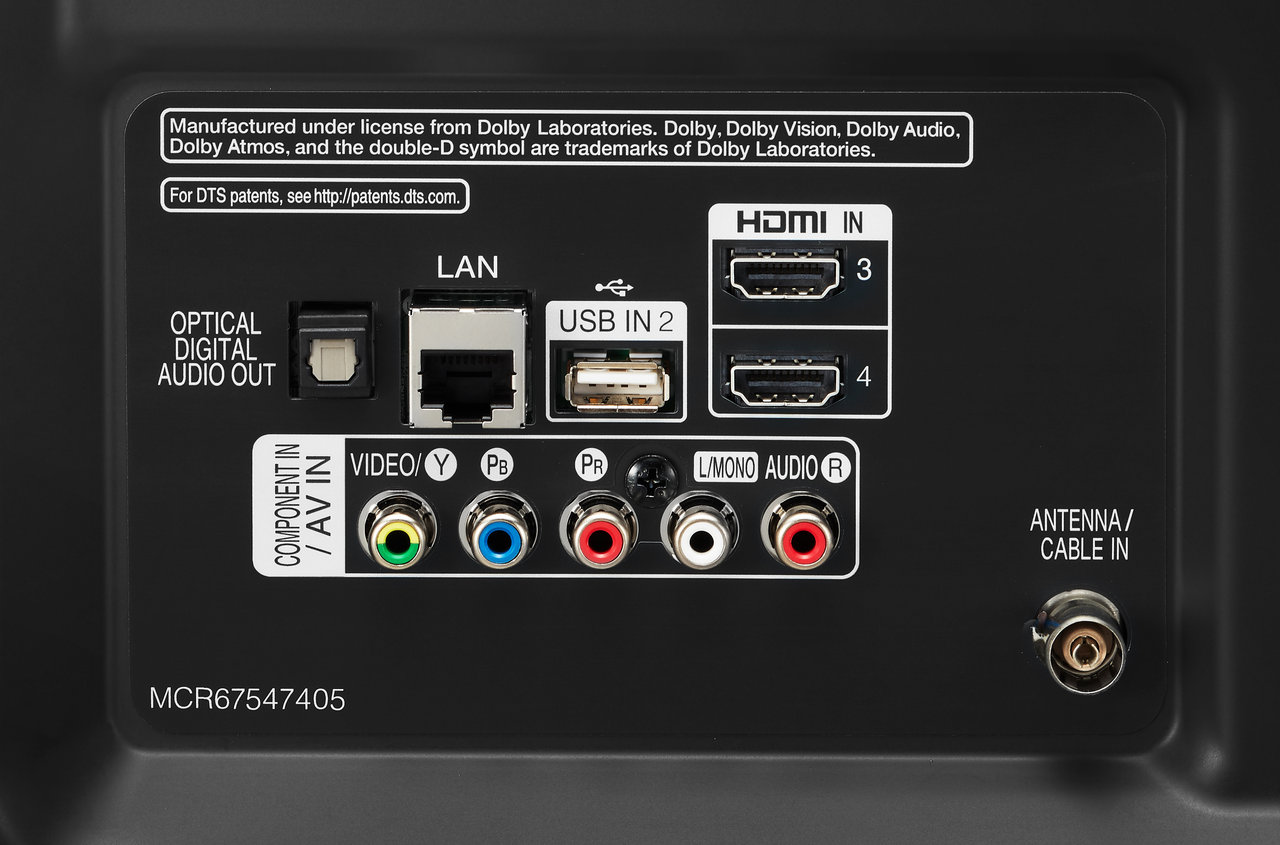 Задняя панель модели LG UM7500 оснащена следующими интерфейсами: два входа HDMI, 2 антенных входа (для спутникового и кабельного/эфирного ТВ), компонентный AV-вход (в версии для США), один порт LAN (со скоростью 100 Мбит/сек), один порт USB (версии 2.0). Что касается аудио, то на этой же панели расположен только оптический аудиовыход, выход 3,5" для наушников отсутствует.