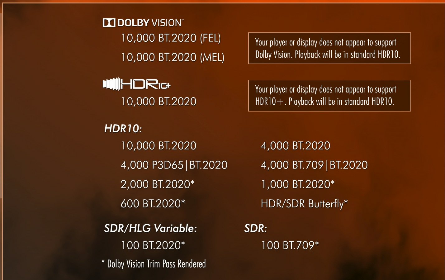- base layer (HEVC Video 61465 kbps 2160p / 23,976 fps / 16:9 / Main 10 @ Level 5.1 @ High / 4:2:0 / 10 bits / HDR10 / Limited Range / BT.2020), и