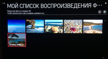 На главном экране присутствуют четыре вкладки: Галерея (отображение работ известных мастеров в рамке, очень красиво и эффектно). Поводов для беспокойства на предмет остаточного изображения нет – форма рамок постоянно меняется. Солнечный день, Дождливый день – в этих режимах выводится успокаивающая анимированная симуляция с видом из окна. Мой список – тут можно проигрывать свои собственные фото или красивые обои. Для примера вот добавил для просмотра несколько файлов с подключенной к телевизору флешки.