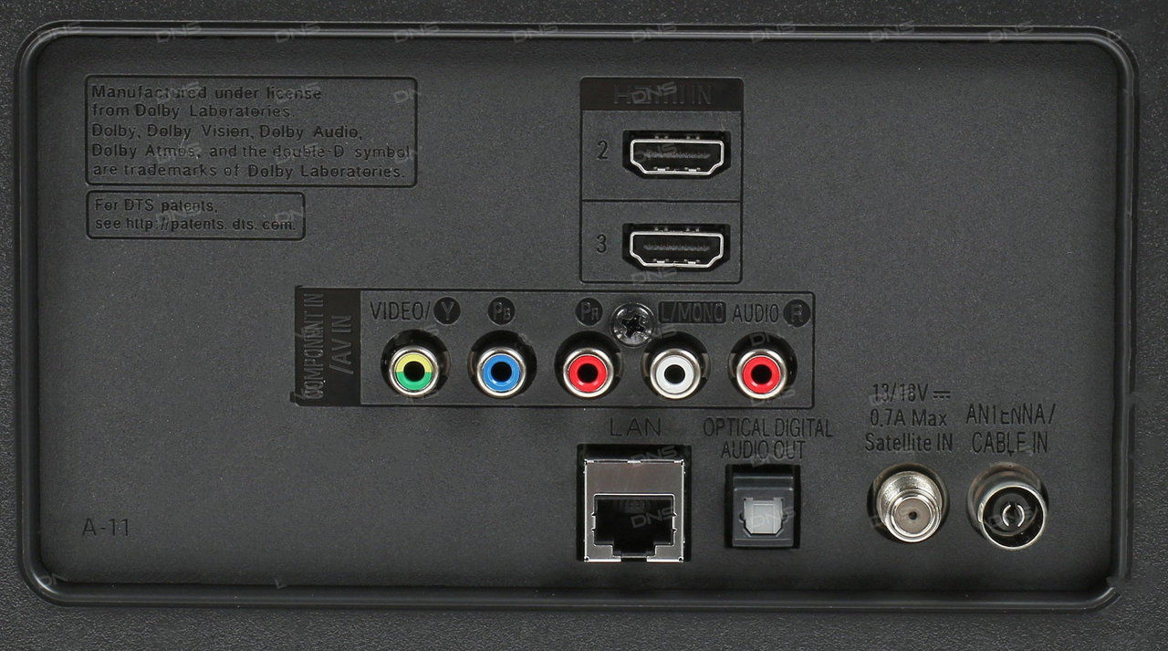Задняя панель телевизора LG LM6300 оснащена следующими интерфейсами: два входа HDMI v.1.4, 2 антенных входа (спутник/кабель), компонентные входы по видео/аудио и 1 порт LAN. Что касается аудио, то на этой же панели расположен только оптический аудиовыход, а выход 3,5 мм для наушников и выход аудио RCA (тюльпан) на два канала, как в моделях 2018 года, отсутствуют.