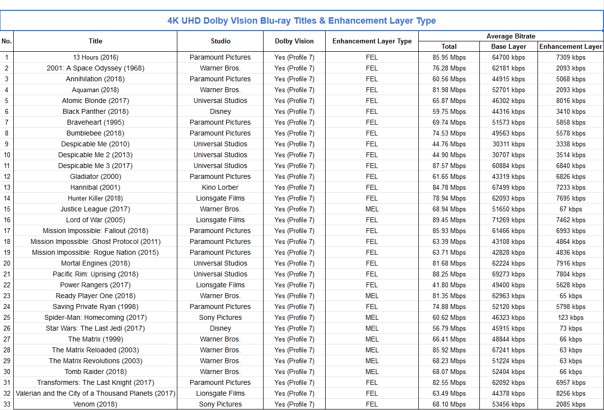 Так вот, судя по приведенной выше таблице, получается, что примерно четверть обозначенных релизов - без "полного слоя DV", т.е. без 12 бит.