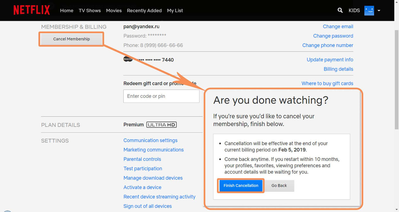Наконец вход в аккаунт осуществлён, приступаем к удалению подписки на нетфликс. Справа вверху страницы кликаем по выпадающему списку (кнопка с треугольником) и выбираем Account. Таким образом переходим на страницу собственного аккаунта, где первым разделом идёт membership & billing (членство и подписка). Всё, что осталось сделать, это нажать на кнопку Cancel Membership. После этого – завершить удаление кнопкой Finish Cancellation.