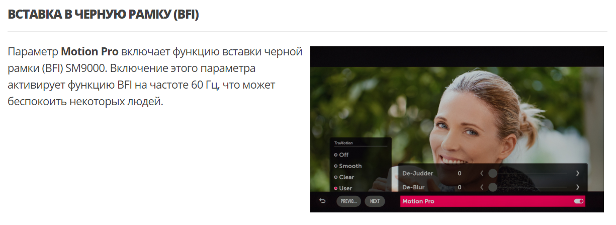Так же продолжаю крутить разные настройки ТВ. Сегодня игрался с TRUE MOTION. В режиме "Пользователь" можно включить опцию MOTION PRO. Данная опция делает картинку чуть темнее, будто бы я сижу в зале кинотеатра. Что больше всего меня удивило, пропали серые засветы в тёмных участках сцен, где при обычном режиме локальное затемнение гасит зоны, пытаясь подавить засвет. А так как я предпочитаю смотреть кино в полностью тёмной комнате, мне эта функция очень понравилась.
