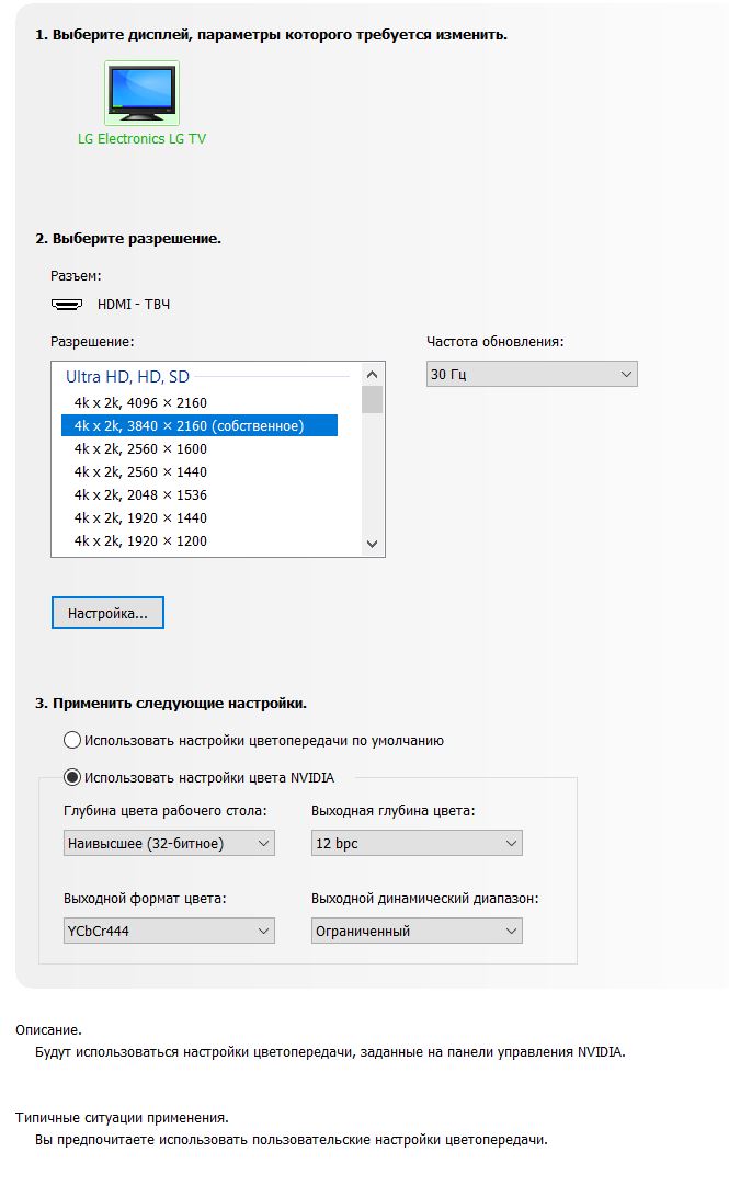 имеем железо видюха 660ti (Максимальное цифровое разрешение - Поддержка разрешения 3840x2160 на 30Гц или 4096x2160 на 24Гц через HDMI. Поддержка разрешения 4096x2160 (включая 3840x2160) на 60Гц через Displayport. Для поддержки MST дисплеев с разрешением 4К требуется драйвер версии 326.19 или более поздний.) переходник в дисплей порт hdmi 2.0 (Адаптер Dell 492-BBXU DisplayPort/HDMI2.0 4K) дальше кабель hdmi 2.0 и телевизор LG 65UF950V упорно не хочет 3840 ? 2160 включать на 60герцах ток 30, а при подключении кабеля hdmi в порт видюхи все нормально только цвета не rbg, а сжатые но частота 60герц. в чем причина помогите!!!