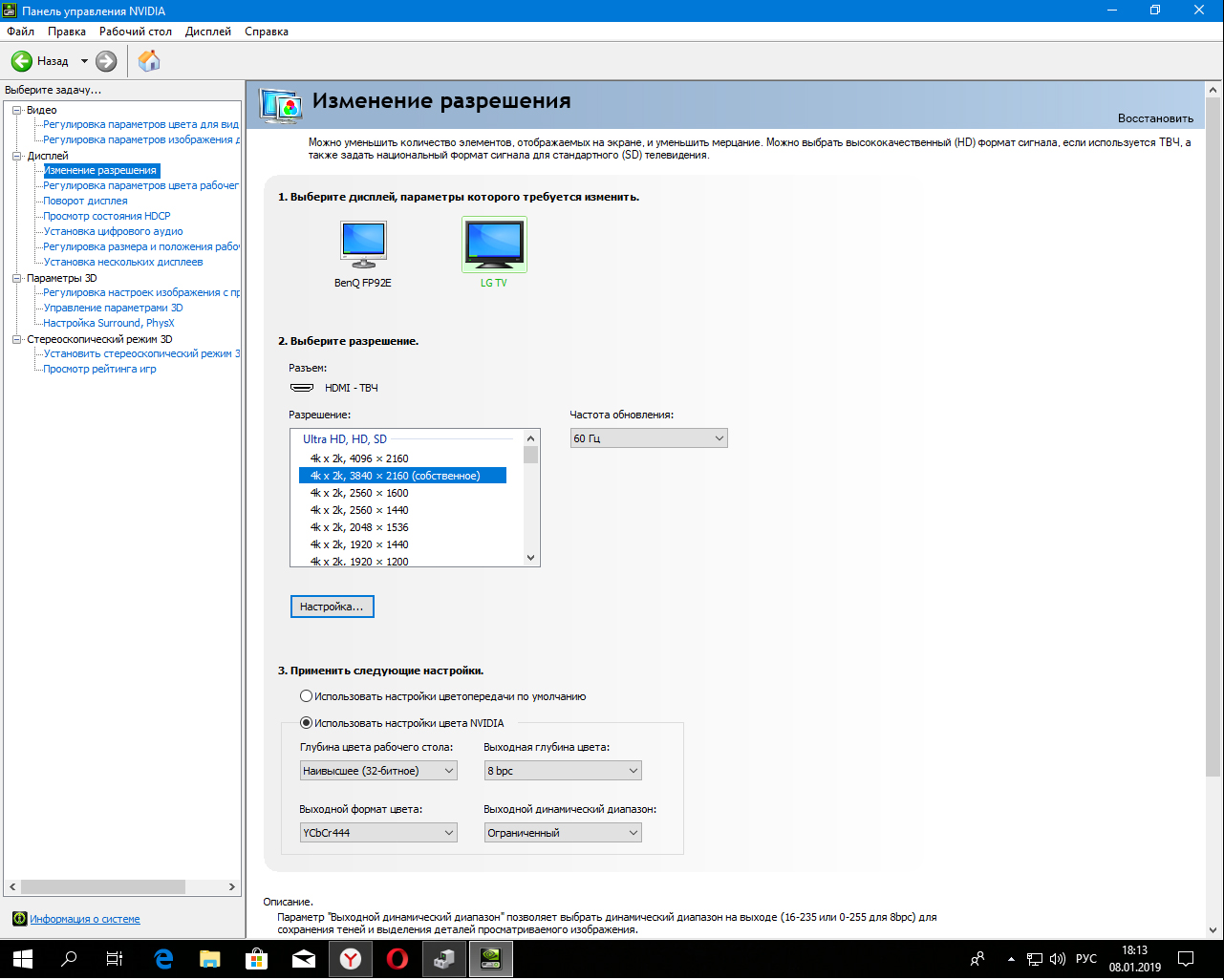 Подниму тему! Купил 75SK8100. Кабель DEXP Premium 5м v2.0 18 Гбит/с.Windows 7. Видеокарта RTX2060 - выводится 4.4.4 и RGB на 4К 60 ГЦ на 8 битах максимум. Пробовал уменьшать герцовку и изменять режимы вывода на 4.2.2 и 4.2.0 - все равно 8 бит. Получается, чтобы вывести 10 битный цвет с компьютера на ТВ, нужна видеокарта с поддержкой HDMI 2.1 (которых нет еще в природе), кабель 2.1 и на телевизоре должен стоять HDMI 2.1? Я правильно понял? То есть никак? Получается - смотреть фильмы 10 бит можно только с флешки? И какой все-таки динамический диапазон и режим надо ставить при использовании телевизора в качестве монитора (для игр и фильмов) полный или ограниченный RGB или ограниченный YCbCr4.4.4 для лучшей картинки и минимального инпут лага?