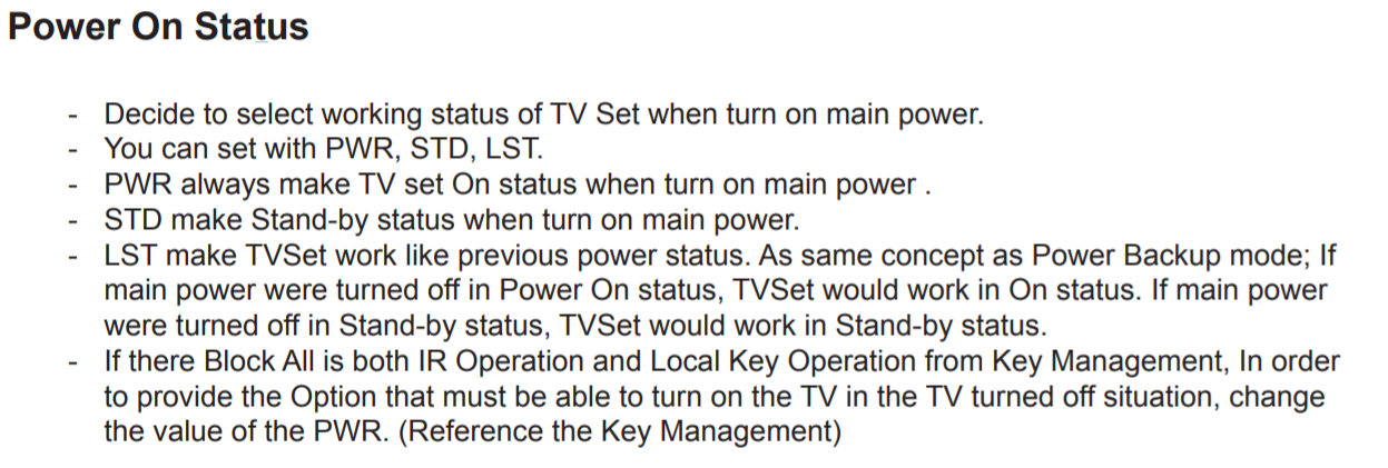- LST заставляет ТВ работать как предыдущий статус питания. Такая же концепция, как и в режиме резервного питания; Если основное питание было отключено в состоянии Power On, ТВ будет работать в состоянии On. Если основная мощность были выключены в режиме ожидания, ТВ будет работать в режиме ожидания.