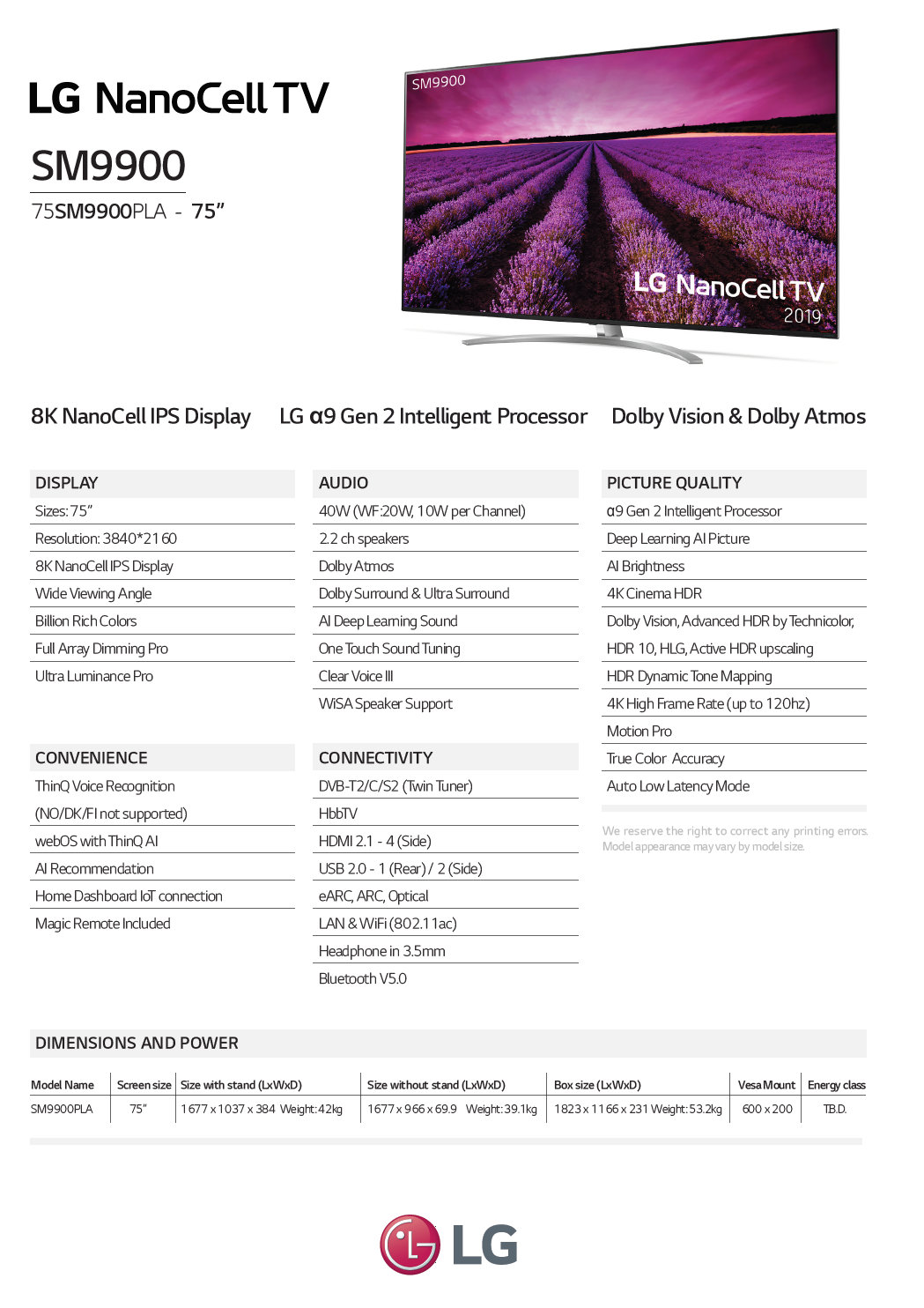 Модель 75SM9900 имеет аппаратную часть, построенную на модернизированном процессоре обработки изображения LG ?9 Gen 2 (Alpha 9, "альфа девять") второго поколения. Данный процессор пришел на смену предыдущему решению Alpha 9 и отличается улучшенными алгоритмами обработки цветов и движений. Для улучшения изображения, в частности, применяются алгоритмы машинного обучения AI Picture, автоматически анализирующие контент (для улучшения звука применяется AI Sound).