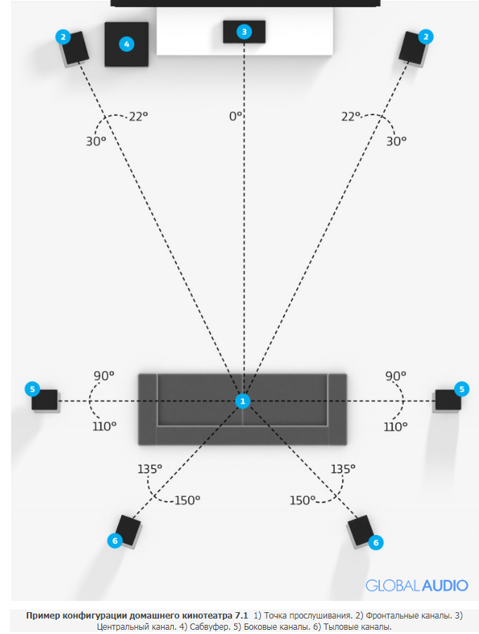 Схематичный рисунок под спойлеромДумайте о каналах как о источниках звука. И хотя большинство музыкальных форматов требуют только два канала (левый и правый), для истинного любителя домашнего кинотеатра нет пределов. В двух словах: чем больше каналов, тем больше динамиков вы можете добавить. И чем больше динамиков вы добавите, тем лучше и более захватывающий звук вы получите.