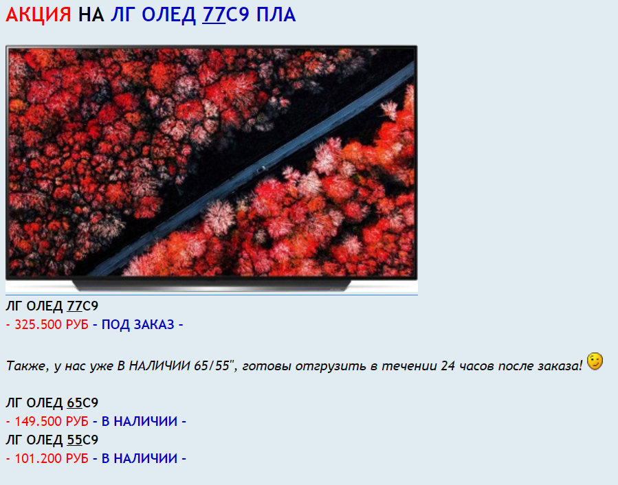 Уважаемы, подскажите пожалуйста цены на Польские серые телевизоры LG С9 55' 65' и 75' - сколько они щас в данный момент стоят. Спасибо.
