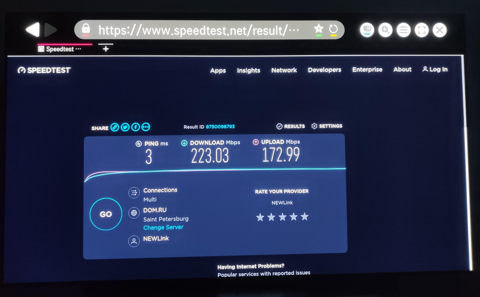 Замерил из любопытства скорость WiFi. В моих условиях по спидтесту из браузера жмёт в пике до ~250-260Мбит, в среднем 200+-.